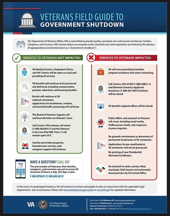 If any veterans, their families, or survivors are confused about what may be accessible, open, or functional, there is a VA Resources number open 24 hours per day, 365 days per year, including during the full government shutdown. Call 1-800-MYVA411 (or 1-800-698-2411).