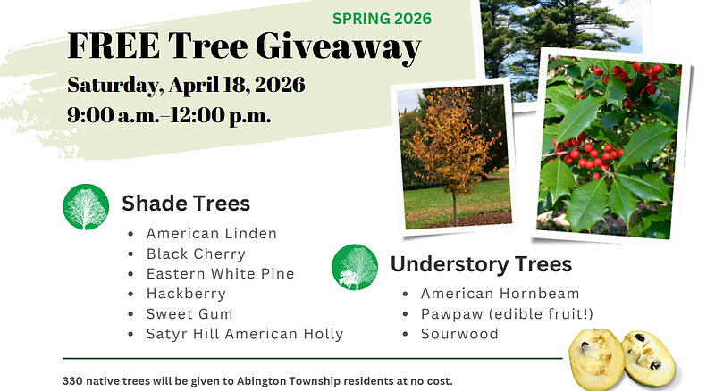 Abington Township is giving away 330 native trees to residents during its Spring 2026 Tree Giveaway, scheduled for Saturday, April 18, from 9 a.m. to 12 p.m. at Crestmont Park, 2595 Rubicam Avenue, Willow Grove.
